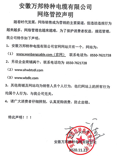 鄭重聲明:安徽萬邦特種電纜有限公司官方網站為:www_wanbangcable_com.lcfxjs.com,除此之外無任何子網站或合作網站,其余均為假冒偽劣。電話:0550-7621728 13485756353 地 址:安徽省天長市滁州高新技術產業開發區經四路29號